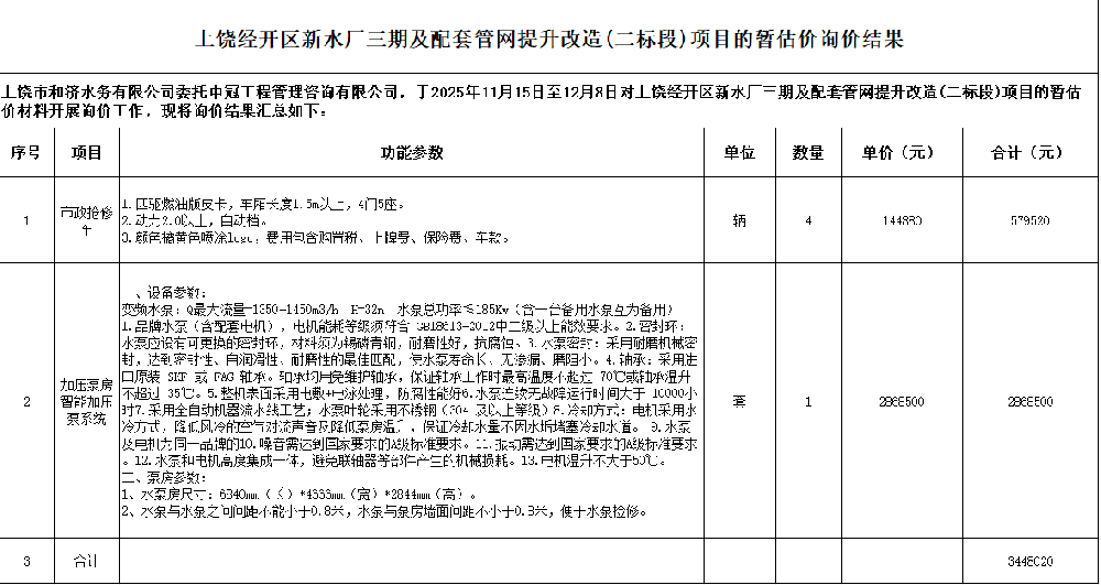 上饶国属工程造价咨询有限公司受上饶市和济水务有限公司的委托,根据上饶市和济水务有限公司的招标计划,遵循公平、公正、公开、诚信原则,对上饶市和济水务有限公司的自来水应急抢修材料供应单位(二期)进行公开询价,诚邀相关供应商对采购单位所需进行报价。一、招标需求1.项目名称:自来水应急抢修材料供应单位(二期)2.采... [更多]