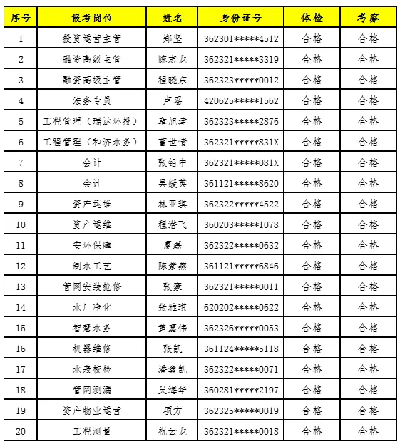根据《上饶创新发展产业投资集团有限公司公开招聘公告》规定的条件和程序,现将经过报名、资格审查、笔试、面试、体检及考察后确定的拟录用人员名单进行公示: